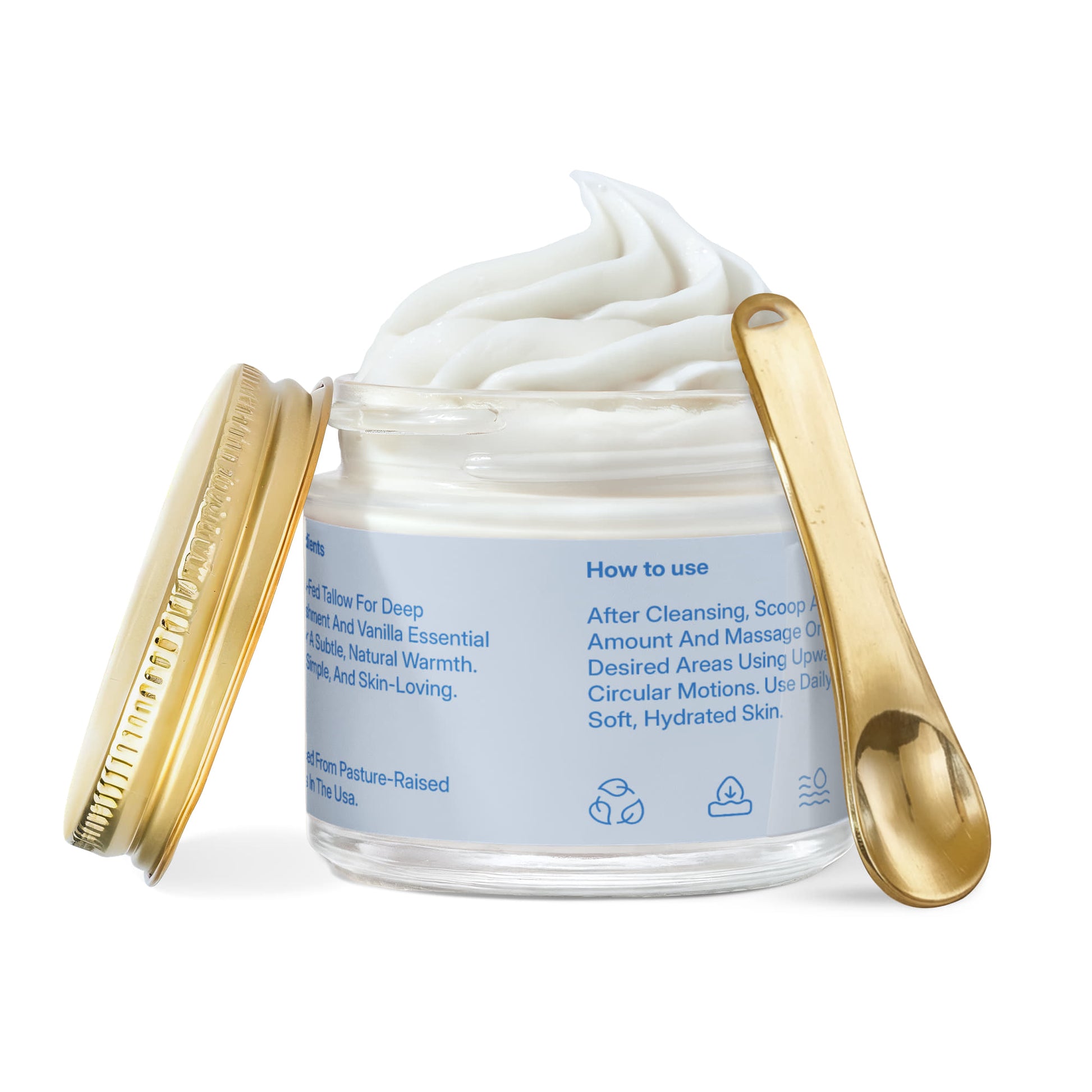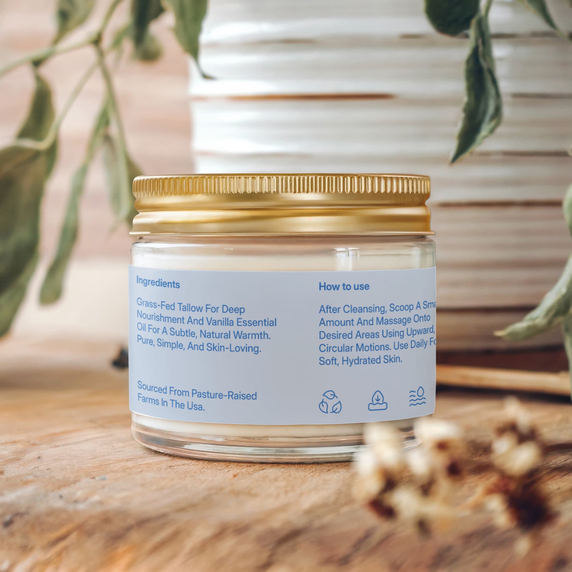 Grass-fed tallow for deep nourishment and vanilla essential oil for a subtle, natural warmth. Pure, simple, and skin-loving.
